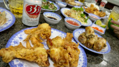 蟹料理といっても高級店ではなく、1缶100円足らずの「333」ビールをひたすら飲みながらカジュアルに食べられる庶民の人気店。