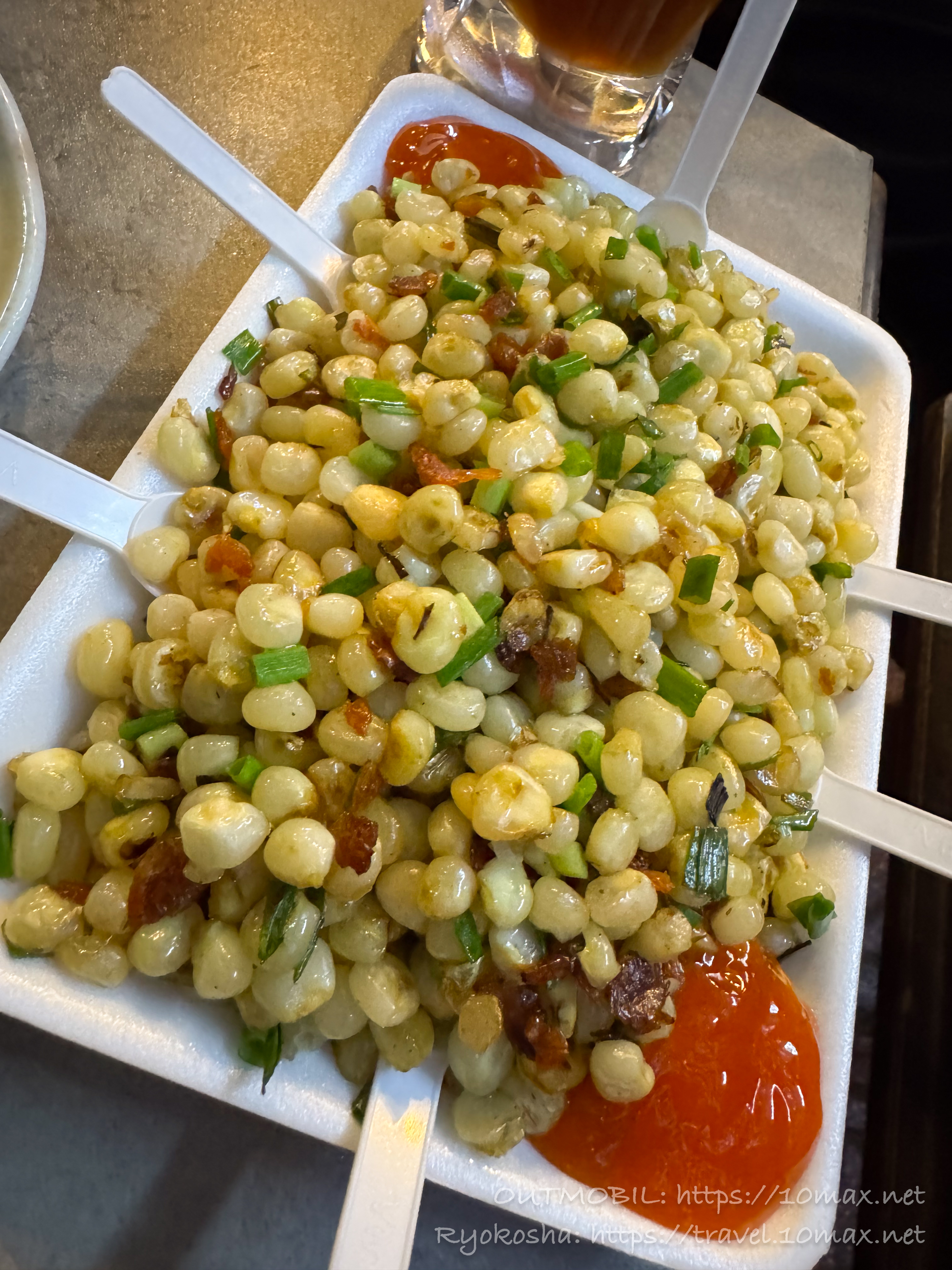 こちらはベトナム風ポップコーンもしくはバターコーン的なおつまみ、Bắp Xào。野菜と一緒に炒められた香ばしいトウモロコシの実を、チリソースにつけて頂きます。こちらも注文するとアツアツの状態で席まで持ってきてくれます。