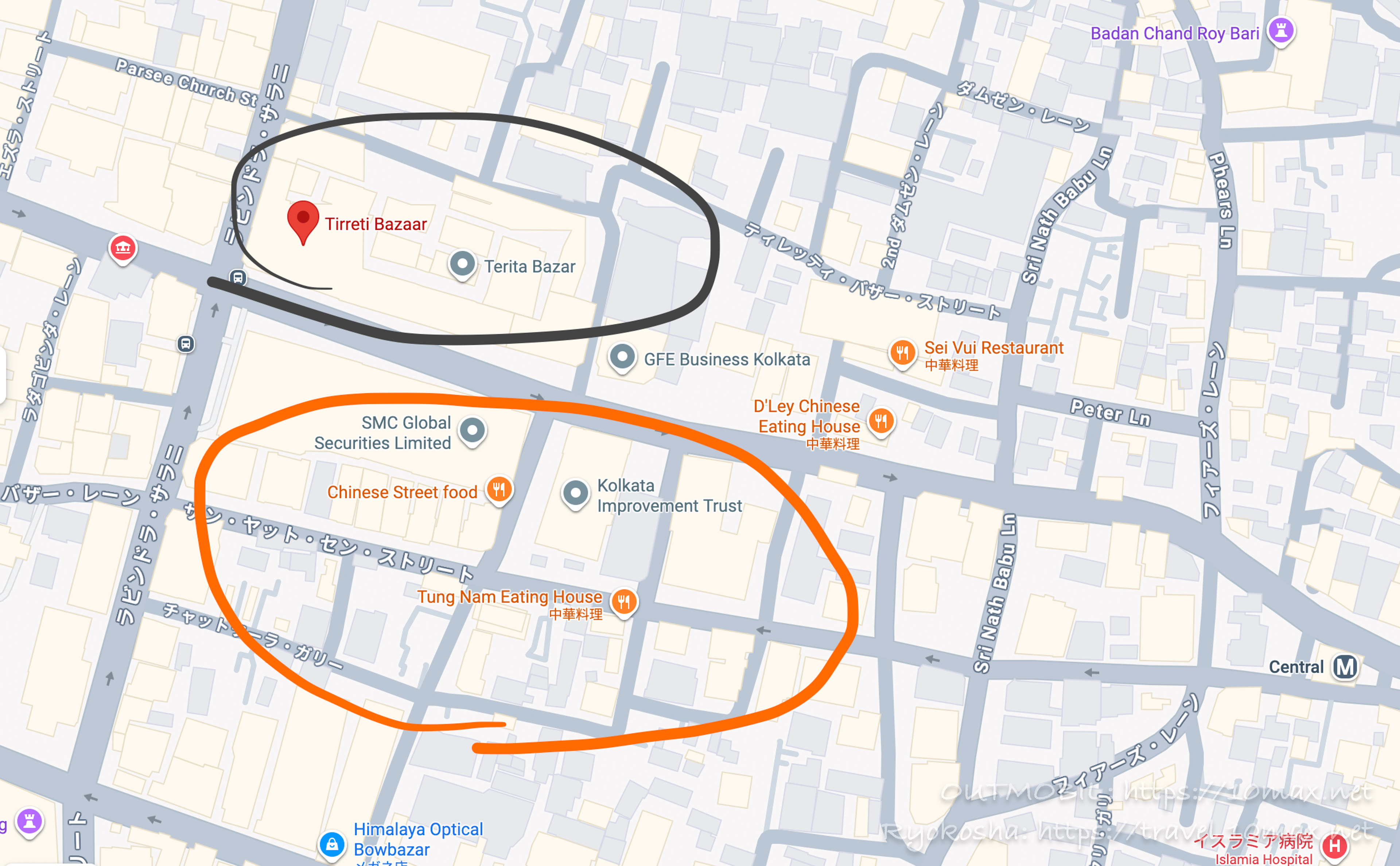 いくつかの日本語の情報源によれば、「ティレッティ・バザール」あるいは「ティレッタ・バザール」という場所にコルカタの中華街があるいうので、Googleマップ上でそれらの場所を検索すると、下の黒い丸の場所が示されるのだが、実際の中華街はその南側のオレンジの辺りなのだ(その辺りの住所もティレッティ地区らしい)。