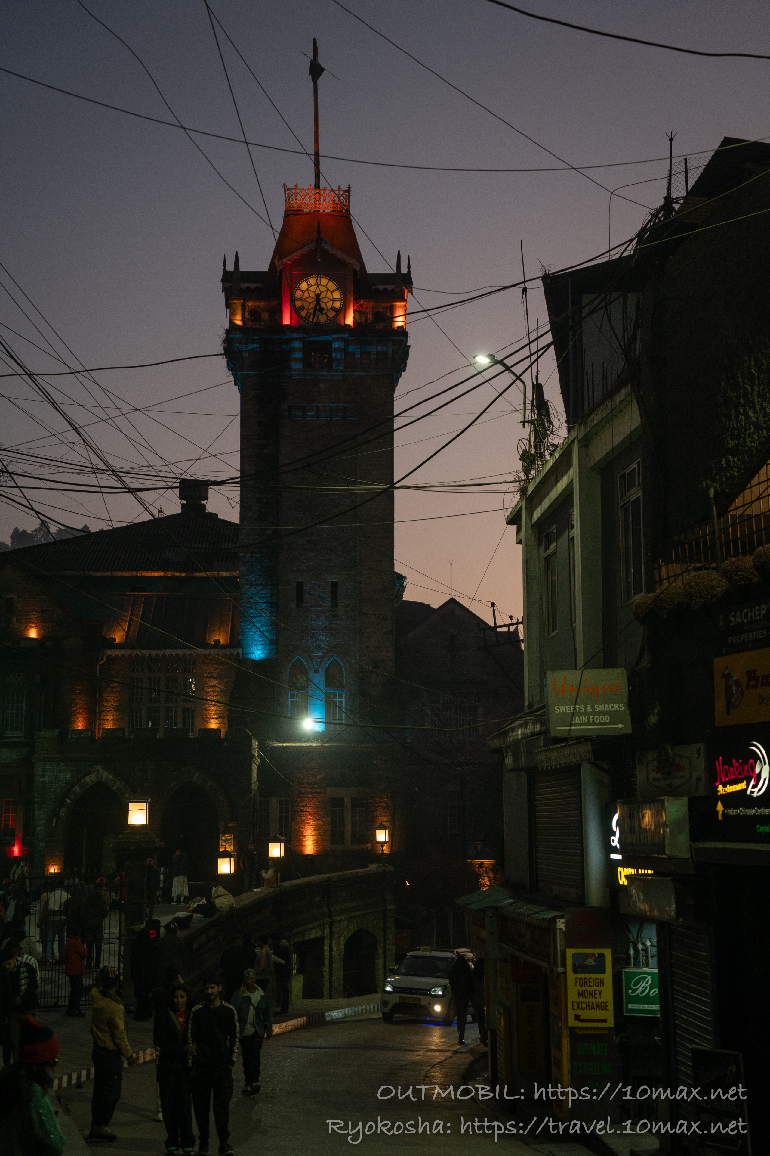 ダージリンのシンボルのような時計塔。時刻はまだ17時半だが、すでにすっかり日が暮れている。日が短い1月であることに加え、標準時が一つしか無いのに広大なインドの東端に近いためでもあるだろう。