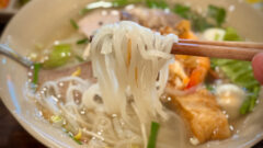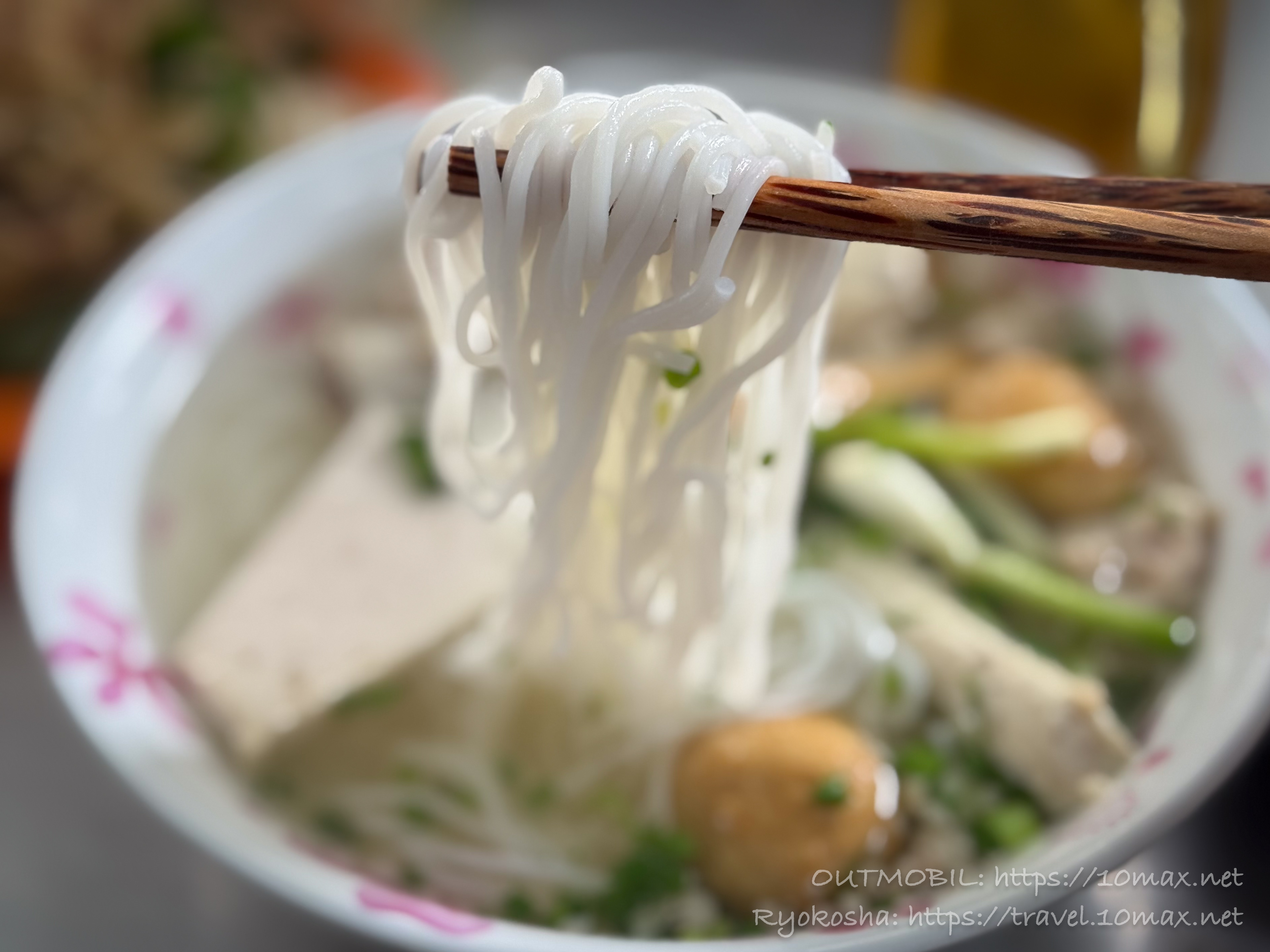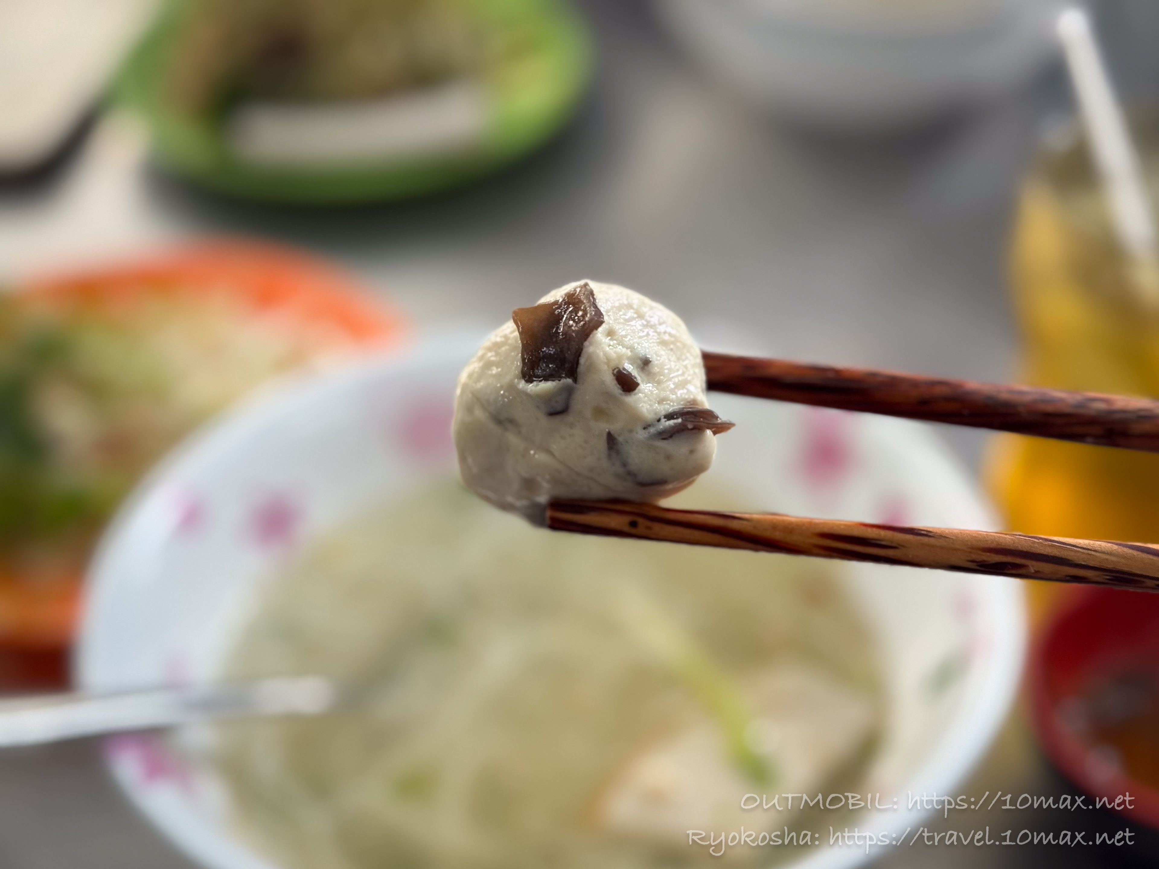 スープは南部風とはやや異なり甘みが少なく出汁の輪郭がクリアなスープで、まずこれが非常に好みです。合わせて、つみれなどの具のバランスも含めて、筆者が知るベトナム麺の中でもかなり上位に入る名麺です。