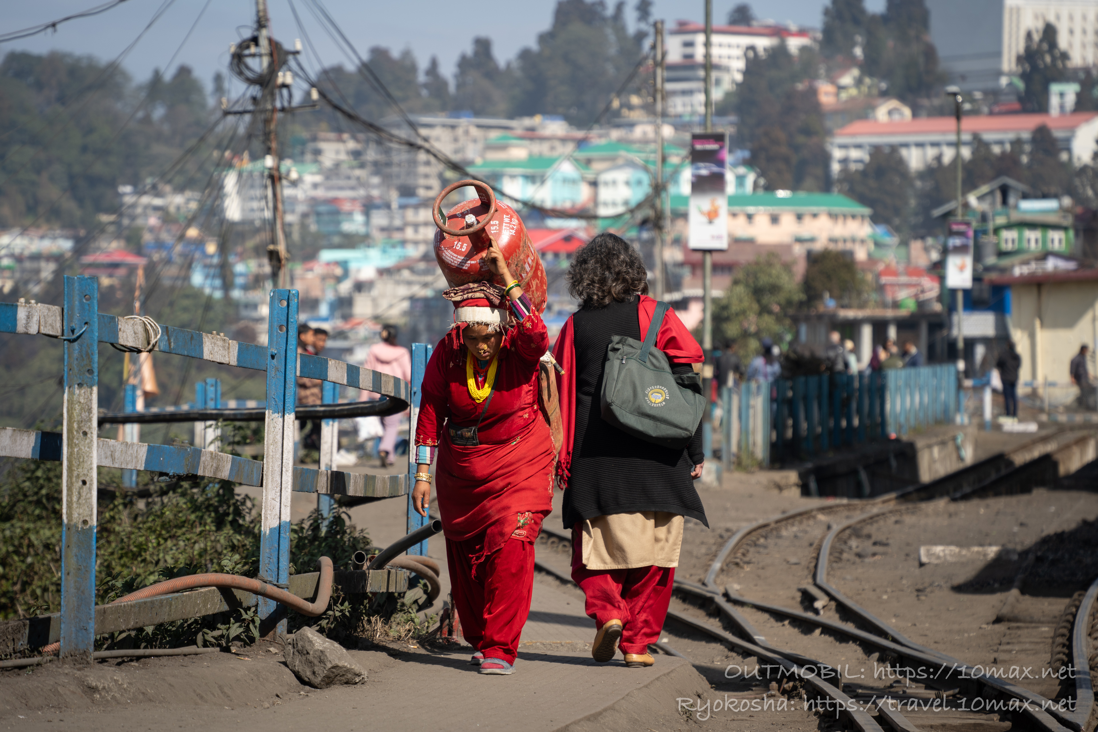 ガスボンベのようなものを運ぶ真っ赤な民族衣装の女性。プロパンガスを購入したのだろうか。