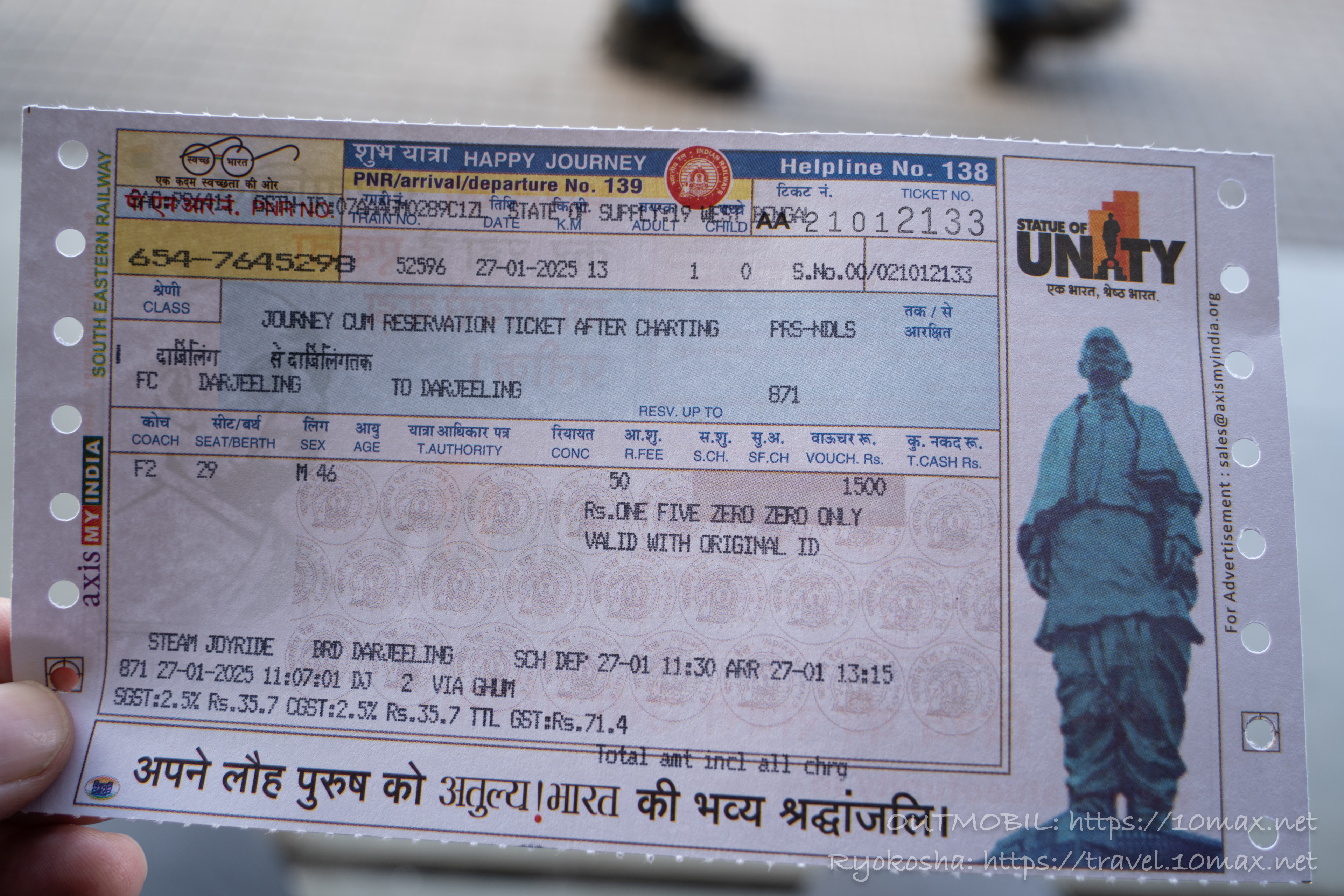 こちらがチケット。STEAM JOY RIDE1名で1500ルピー。観光用なのでさすがに高い。