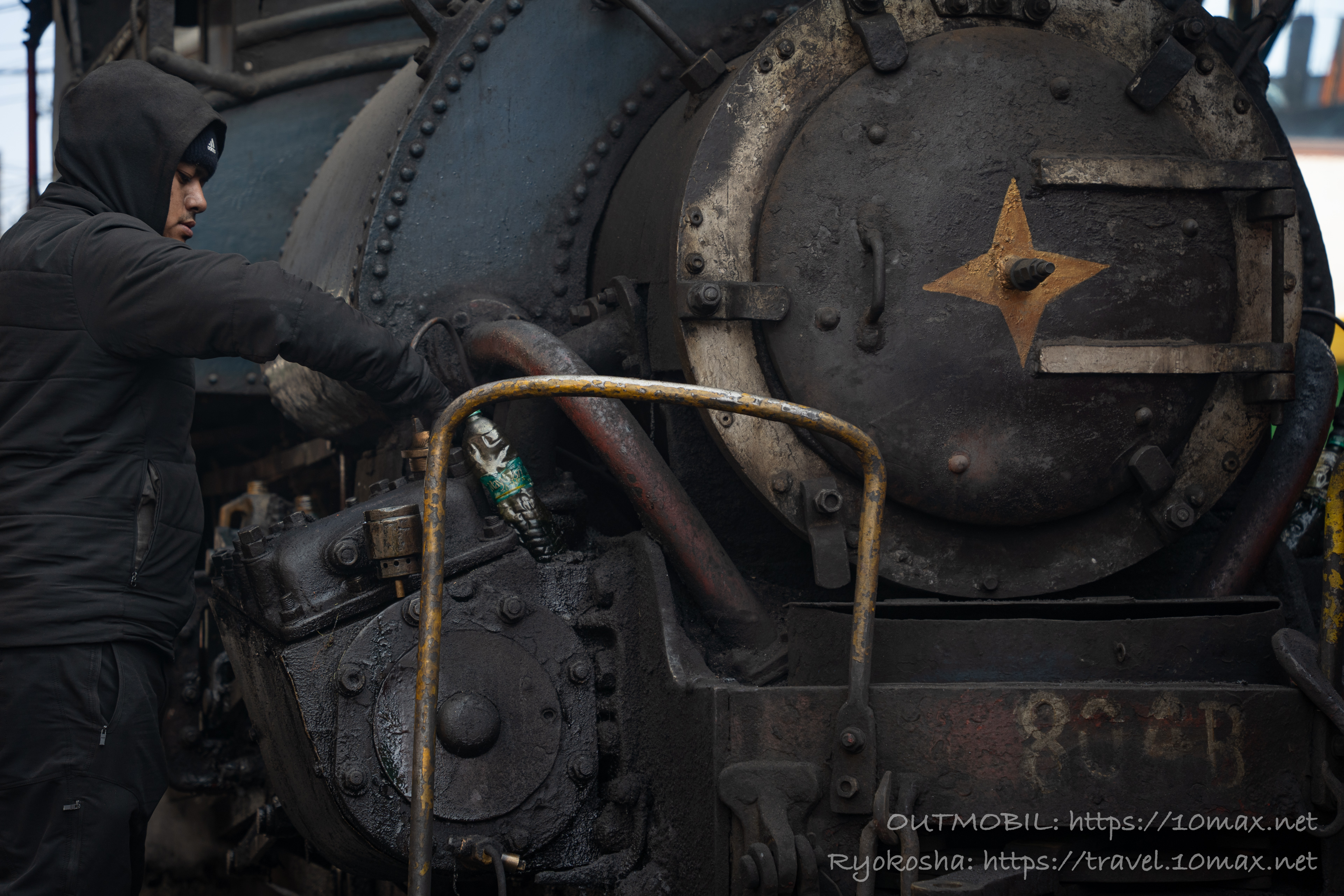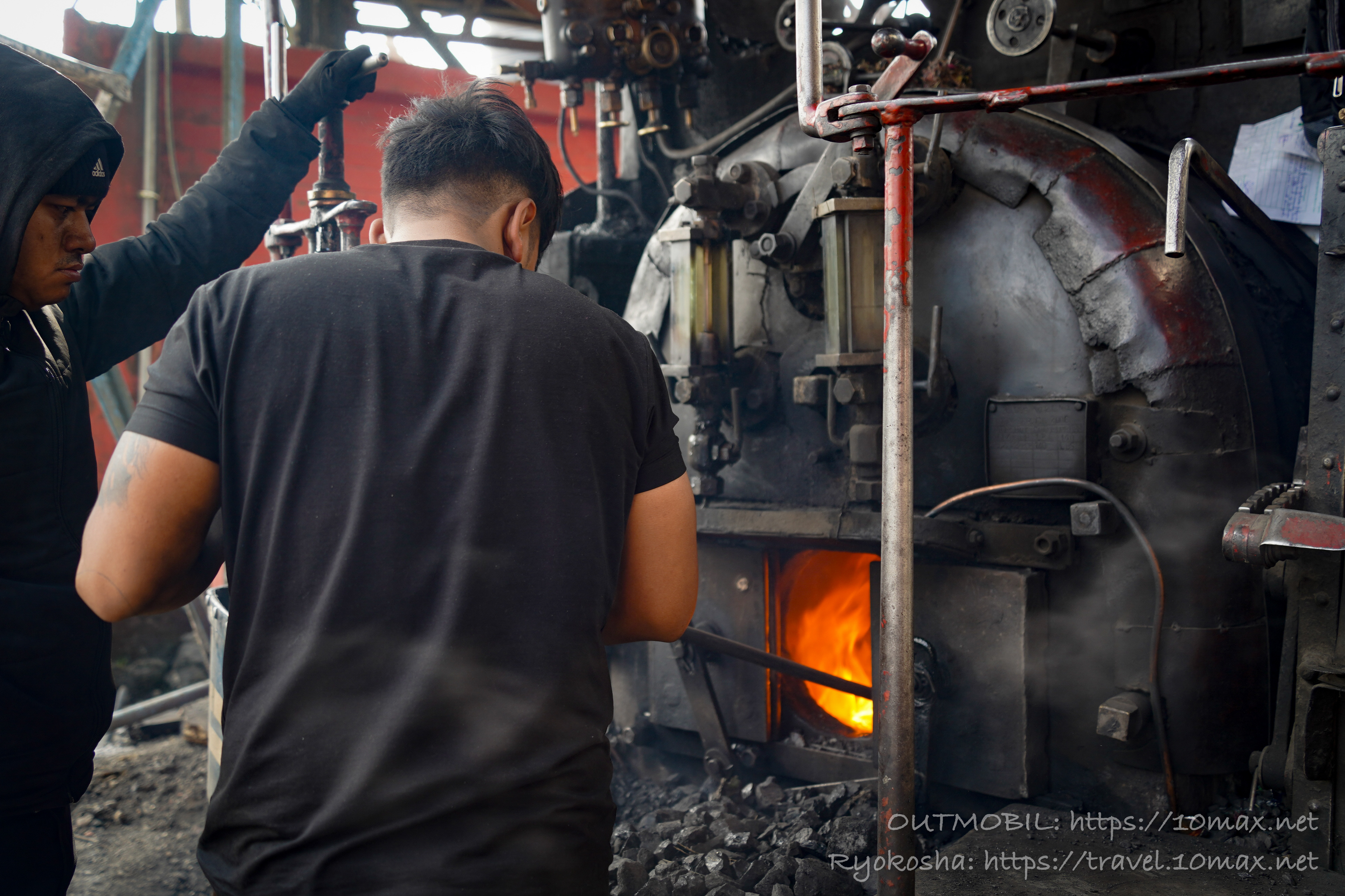 作業員が石炭を入れ替えて次の運行の準備をしている。改めて、この蒸気機関車が石炭で走っているのだ、ということを思い起こさせる。
