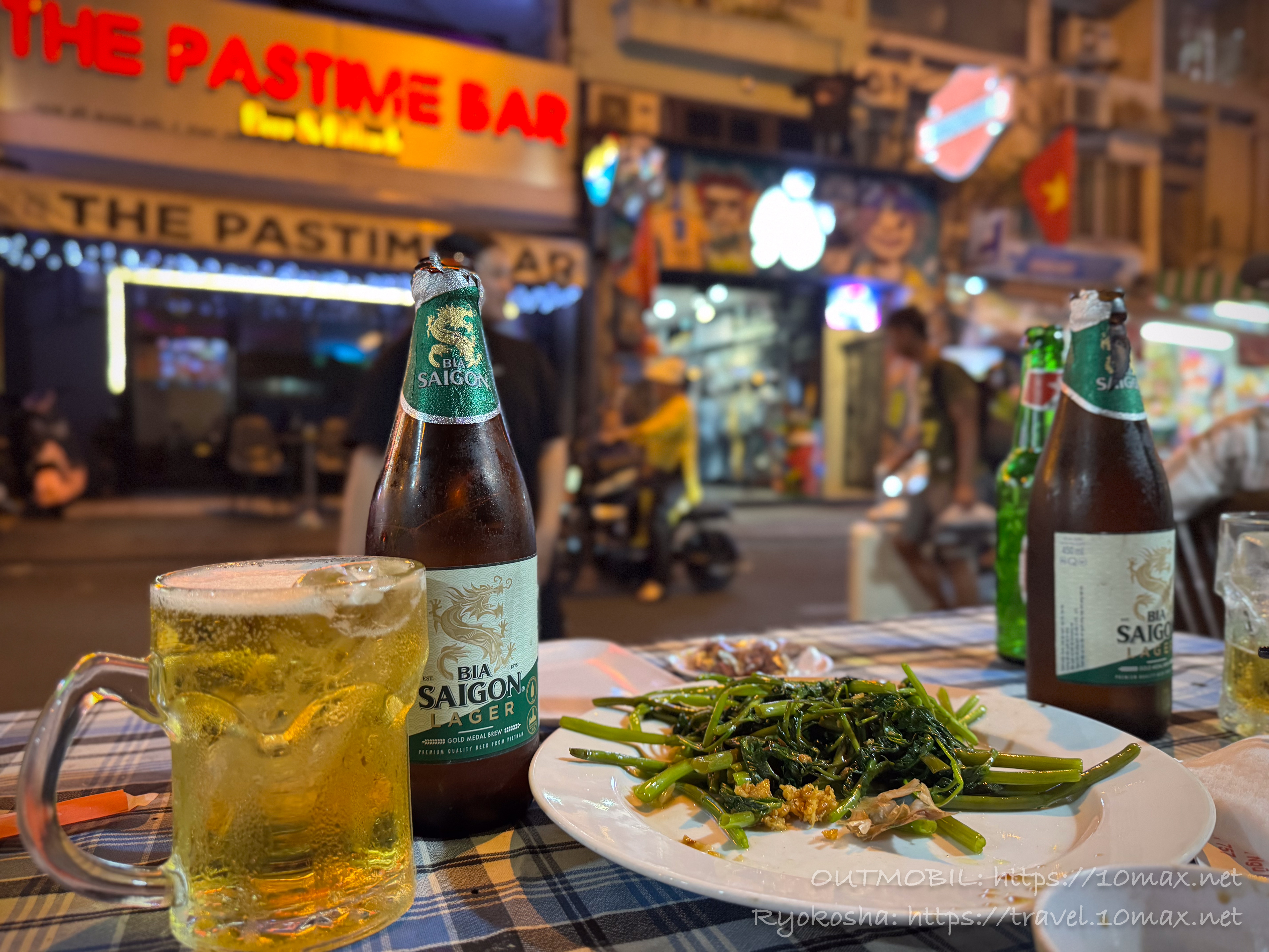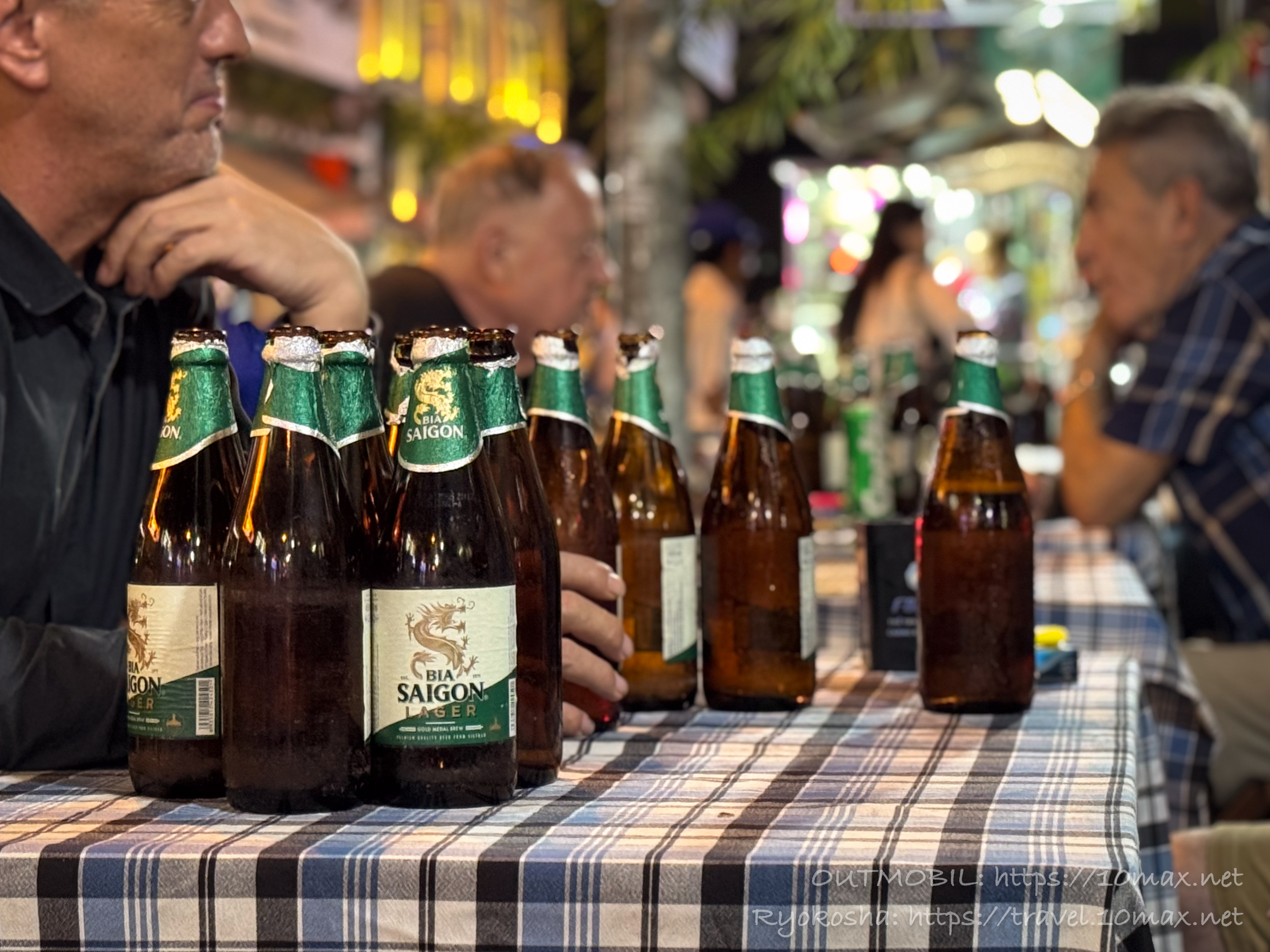 そして特筆すべきは、ホーチミンの他のローカルな飲み屋街には無い異国感。ここは流石ブイビエン/ファングーラオエリアということで、様々な国籍の客がビアサイゴンの瓶を林立させています。